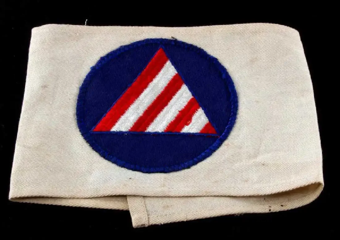 State and Local Staff Corps armbands differ from the foregoing as follows: the basic "CD" insignia, not including "U.S.", 4 inches in diameter, was attached to the armband at the top edge, center. Initials, or state abbreviations such as "S.C" for South Carolina, or "Mass." for Massachusetts, appeared below the basic "CD" insigne, such letters running in a horizontal line on the armband.