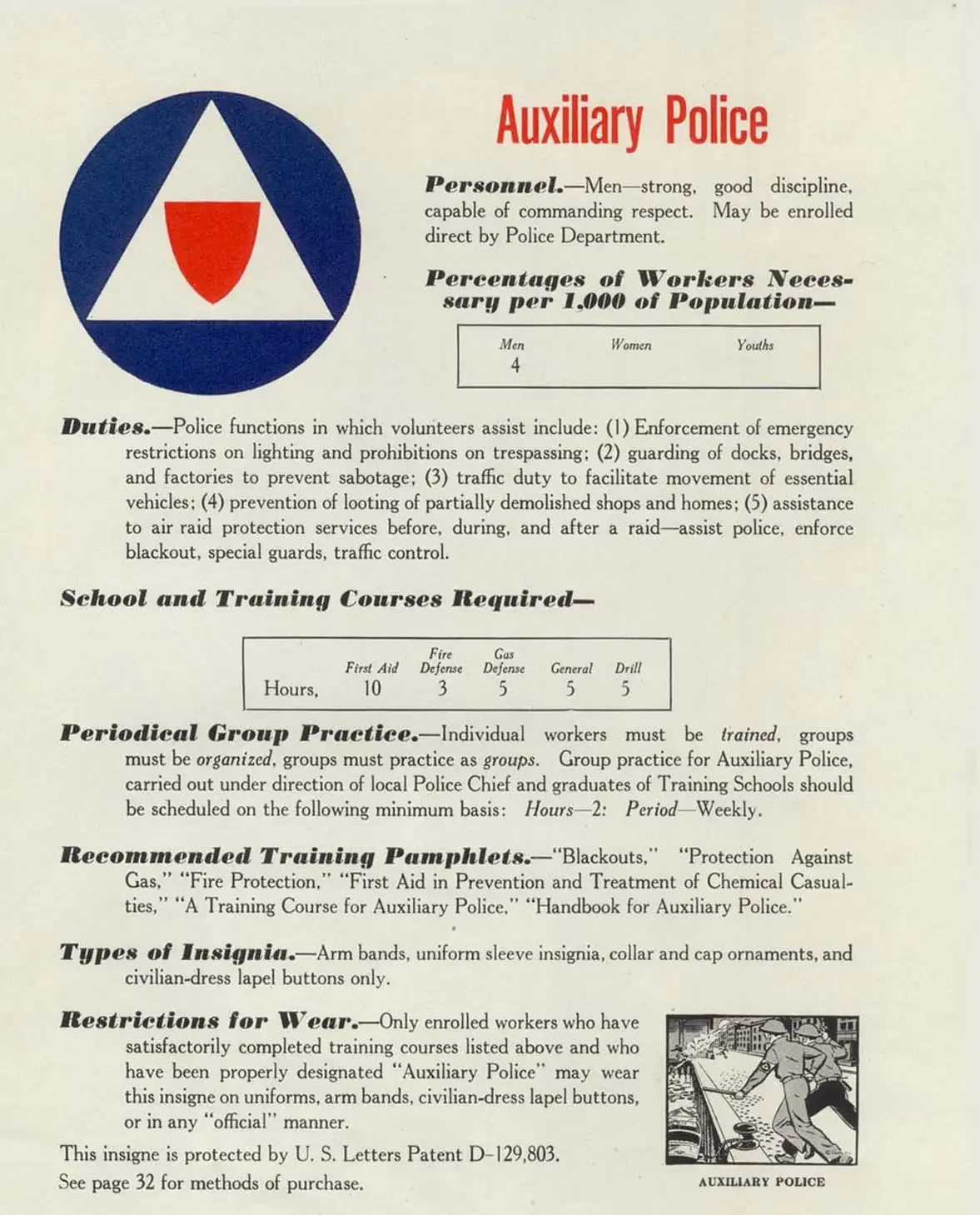 “Plans should be made at this time for an auxiliary police corps. Enrollment should take place at police precinct station houses or police headquarters. Men of good character and physique not subject to military draft should be sought for enrollment.