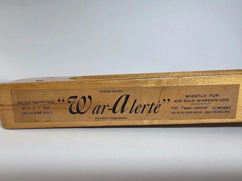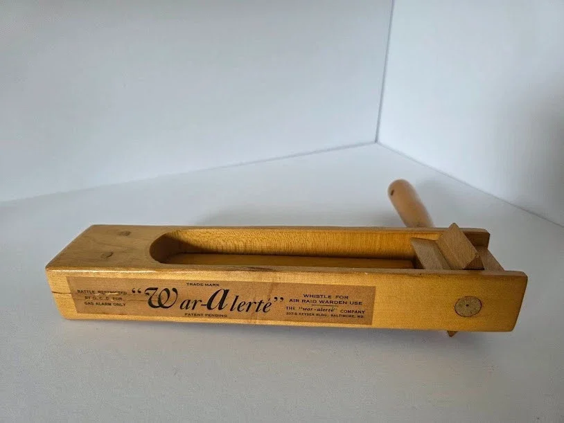As a lot of the US civil defense measures were based on the experiences of the British, a similar gas rattle was issued to air raid wardens. In the event of the use of poison gas by the enemy, the sound of a rattle/clacker would be used. These would provide a warning to the public to wear their gas masks.
