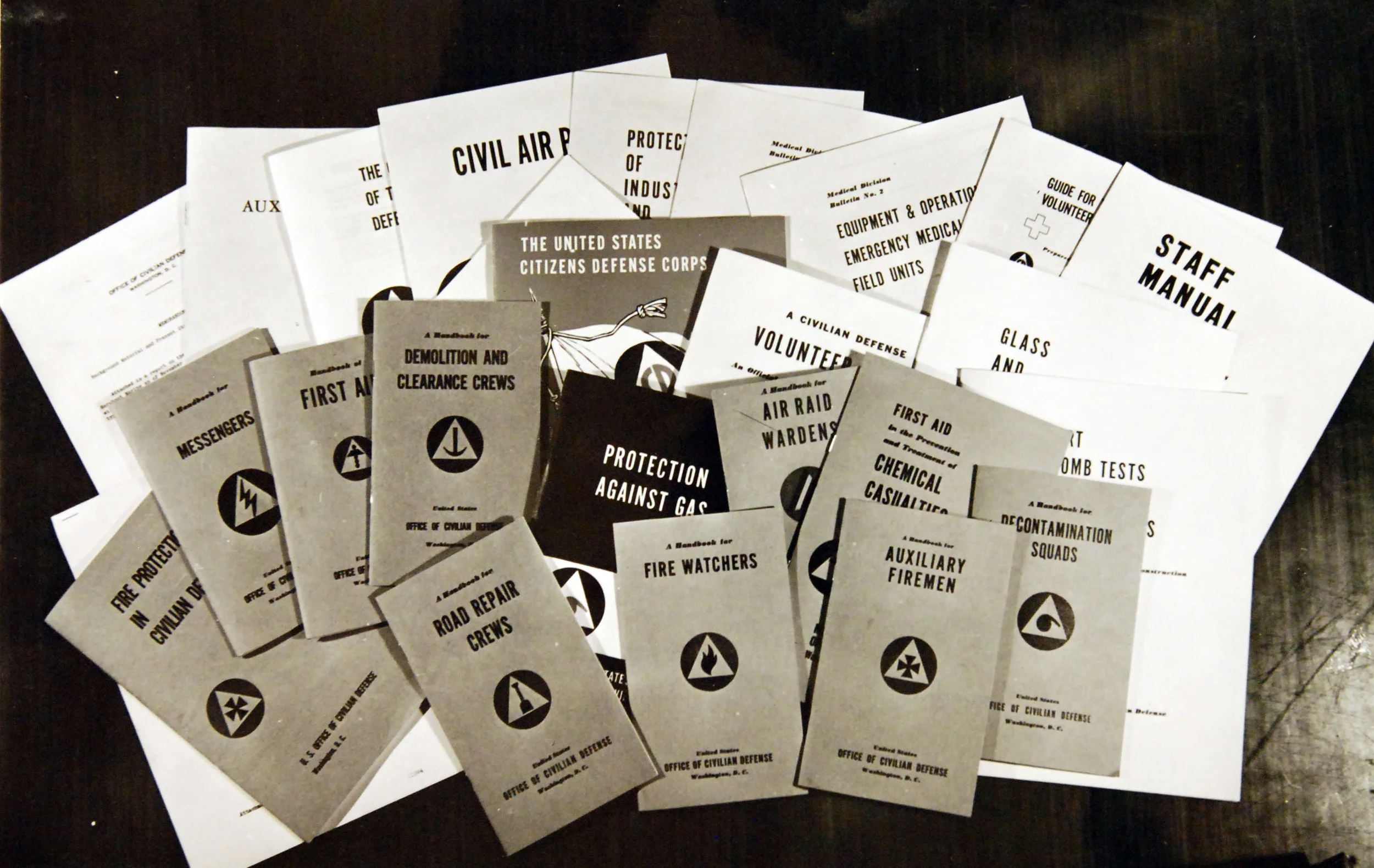 Collection of military and civil defense manuals and pamphlets, including titles such as 'The United States Citizens Defense Corps,' 'Demolition and Clearance Crews,' 'Protection Against Gas,' and 'First Aid.'