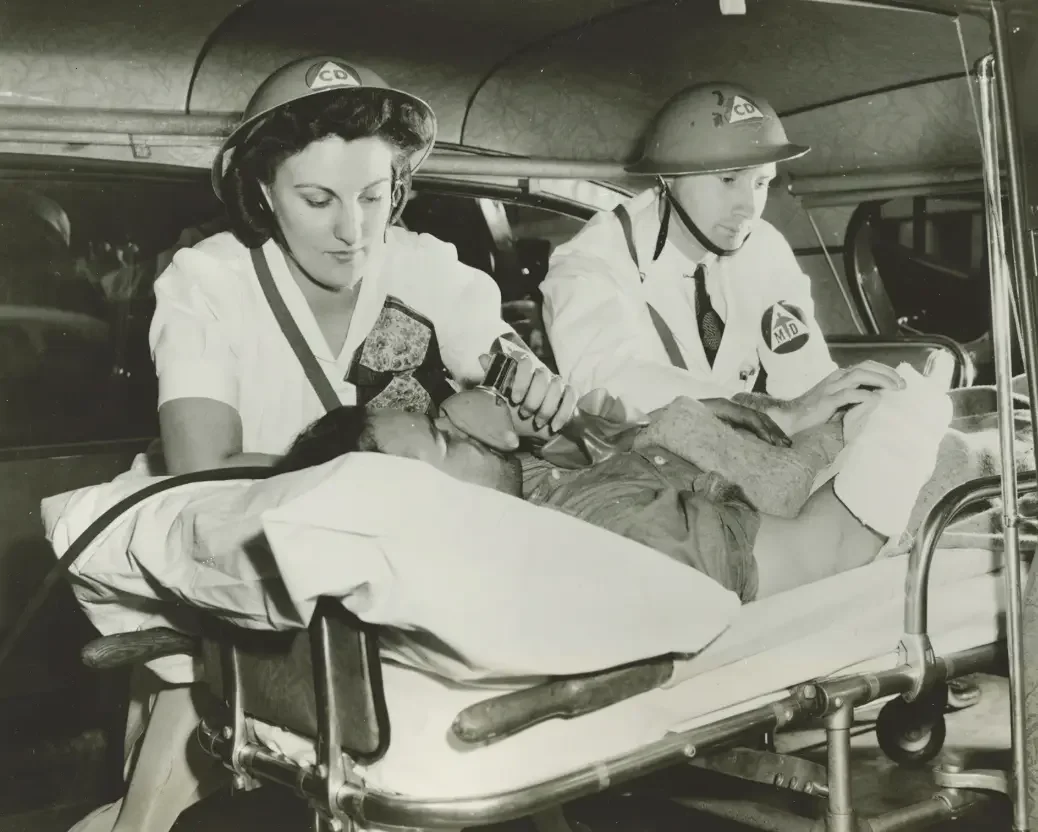 At the scene of an air raid (or any other disaster), the Medical Corps (sometimes referred to as Medical Field Units) handled all casualties. These units were organized through local hospitals and consisted of various squads of doctors, nurses, nursing auxiliaries, and nurses’ aides.