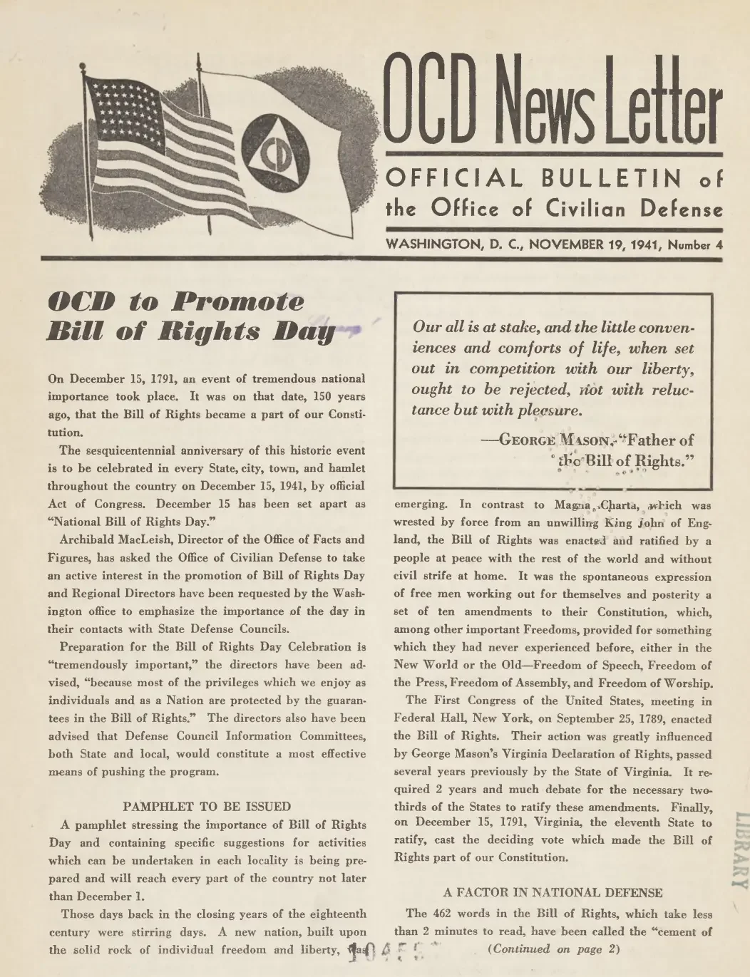The bulletin contained various articles concerning the OCD, updates from the Director, news from State and local defense councils, lists of OCD publications, regional appointments, blackout and dimout guides, as well as articles on salvage campaigns and home front news.