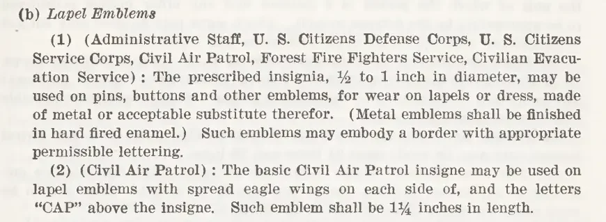 Every unit of the OCD had a specific pin badge (civilian-dress lapel buttons) featuring the emblem of that service. The small pins were to be worn in the buttonhole of the left lapel or pinned over the left breast.