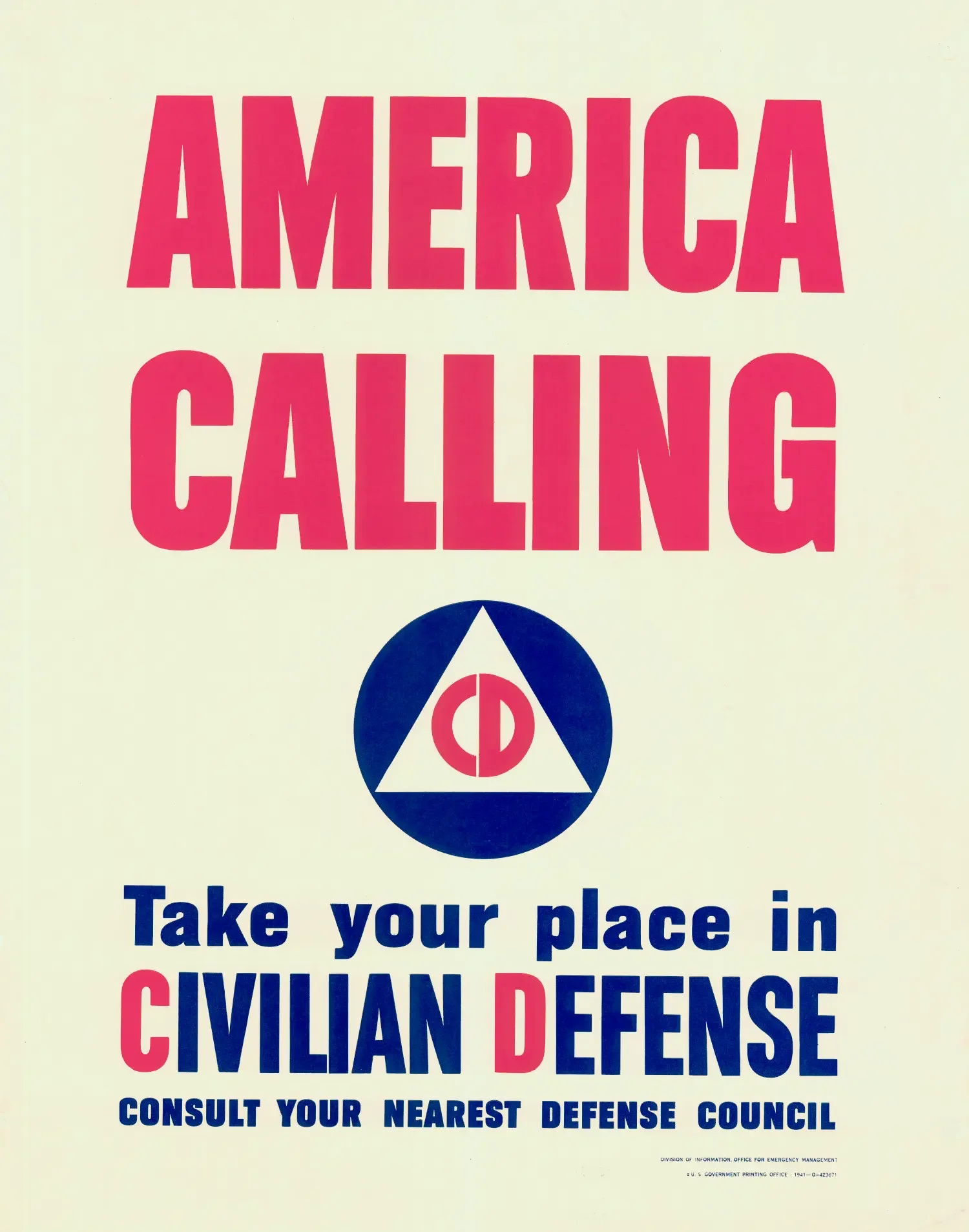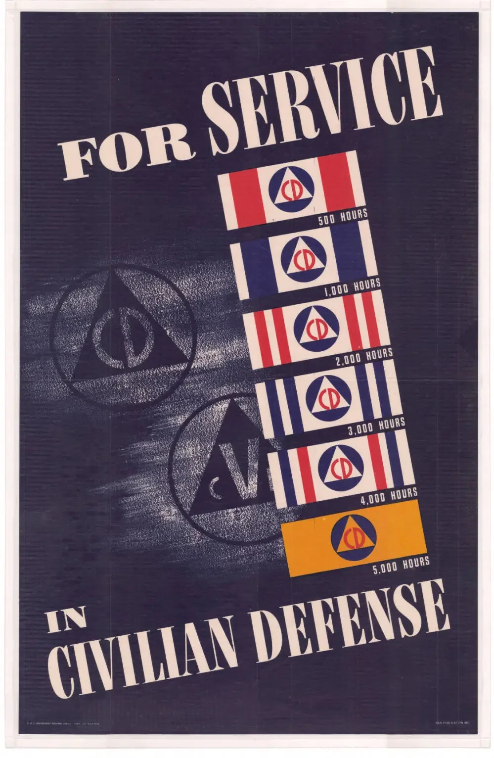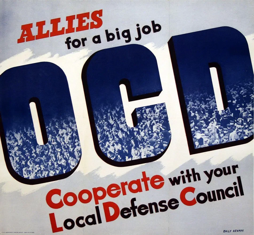 The Office of Civilian Defense issued a large number of posters during World World II. Many were to encourage enrollment in the Citizens Defence Corps as well as encouraging members of the public to join the Citizens Service Corps. Other posters were issued to educate the populace about air raid drills and how to deal with incendiary bombs.