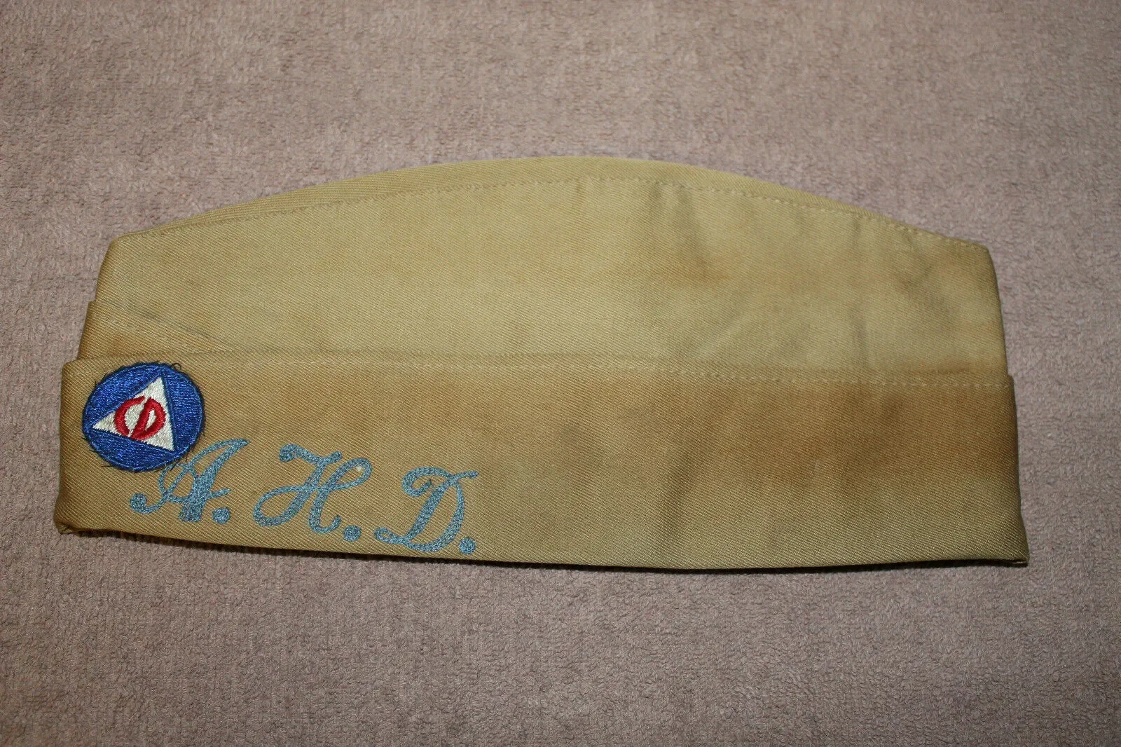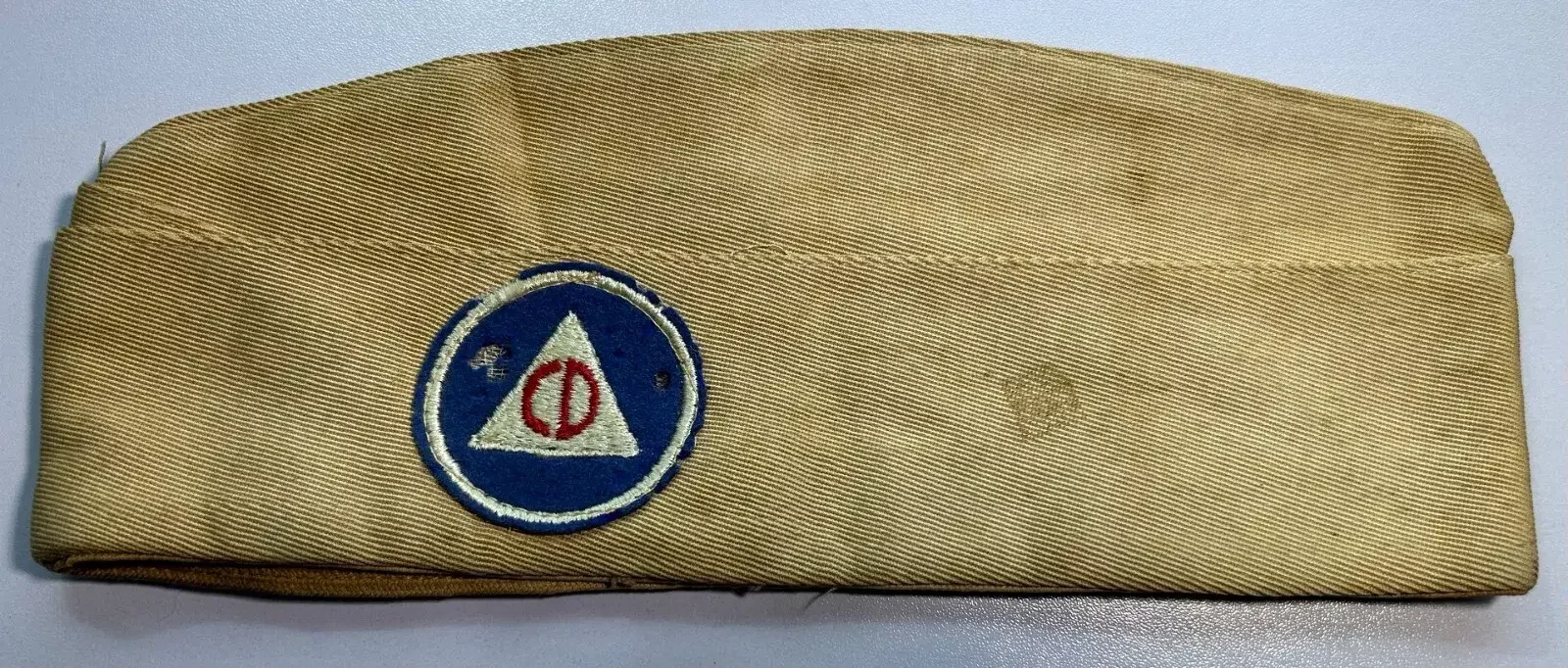 Many enrolled volunteer members of the Civilian Defense Corps units acquired white, light colored or light-tan garrison-style side caps. To these caps they added either the official unit emblem for the service they were working with or the generic ‘CD’ emblem.