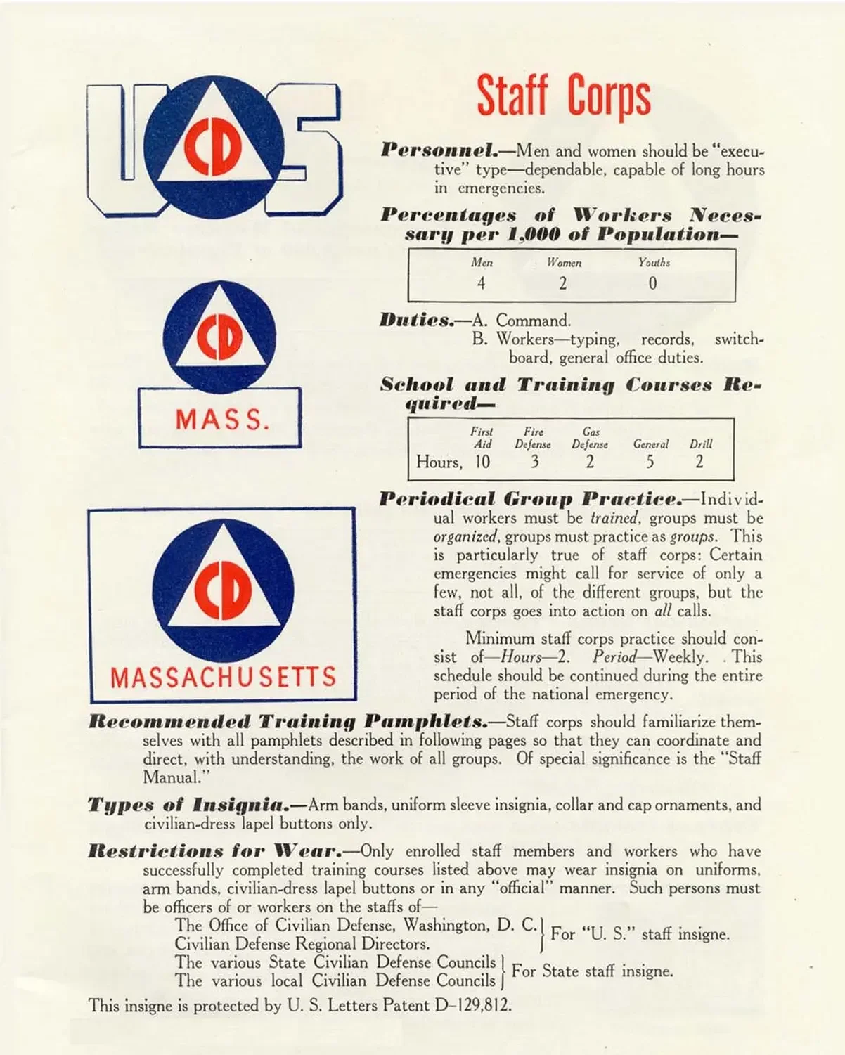 “The prescribed insignia for the Administrative Staff shall consist of the basic insigne of the Office of Civilian Defense, which, when used by persons employed or appointed in any capacity in the Washington office and Regional Offices of the Office of Civilian Defense, may be superimposed on the letters “US” (in the form of an applique emblem granted by Letters Patent No. D-129812 of October 7, 1941), and when used by members of State Defense Councils or Local Defense Councils, or Committees thereof, including the local Civilian Defense Volunteer Office, or persons who are employed or appointed by such Councils or Committees as staff members or employees, may be used together with the name, or abbreviation of the name, of the particular State or community.